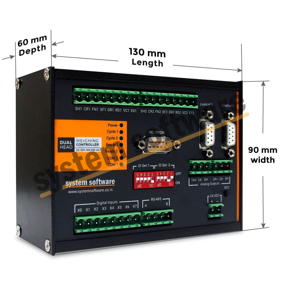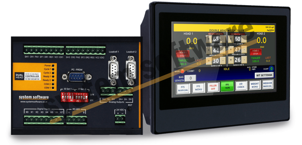 The Dual Head Weighing Controller is one of its kind controllers that can perform weighing actions of two independent weighing stations. (i.e. two separate loadcells). The controller is primarily designed for double head weighing and filling systems. This controller can be synced with several of its kind of controllers to obtain multiple head weighing controls.