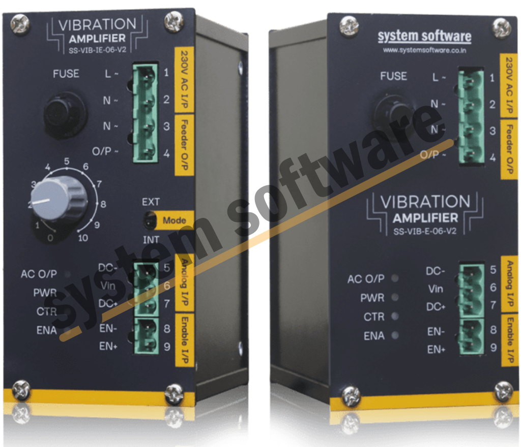 The linear vibratory feeder amplifier by System Software is used to interface linear feeders operating on 230 V AC with PLCs using an analog control interface. The amplifier is microcontroller based to give best results in vibration speed control in linear feeders. This controller can generate coarse, fine, superfine speeds in the vibratory feeders.